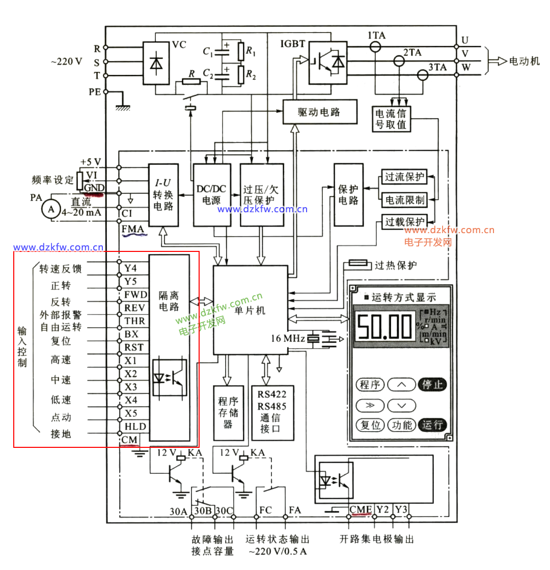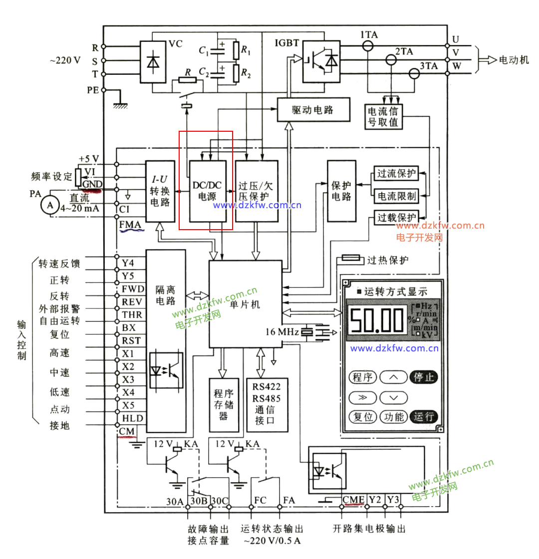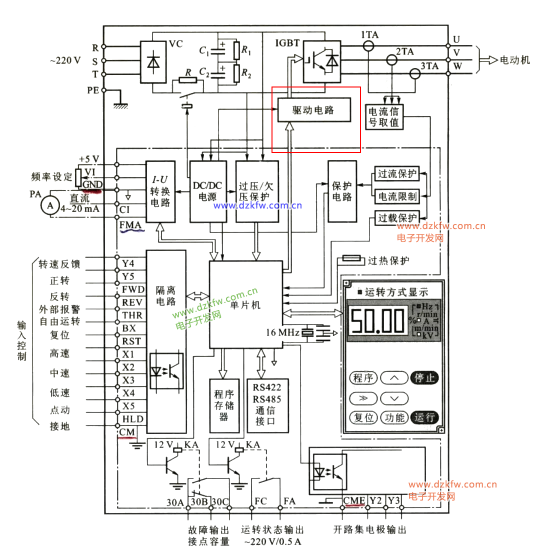 整流電路、起動保護、濾波電路、逆變電路 、指示電路 、制動單元 、輸入端子、 輸出端子。