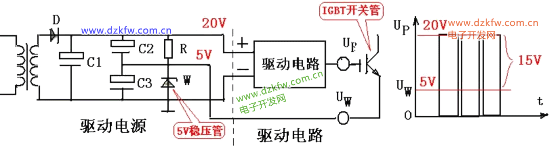 電路作用:為驅動電路提供直流電源。該電路由一只5V穩壓管取得5V電源,加在IGBT開關管的發射極上,使驅動信號在零時,保證IGBT控制極為5V的負電壓,使管子可靠的截止。