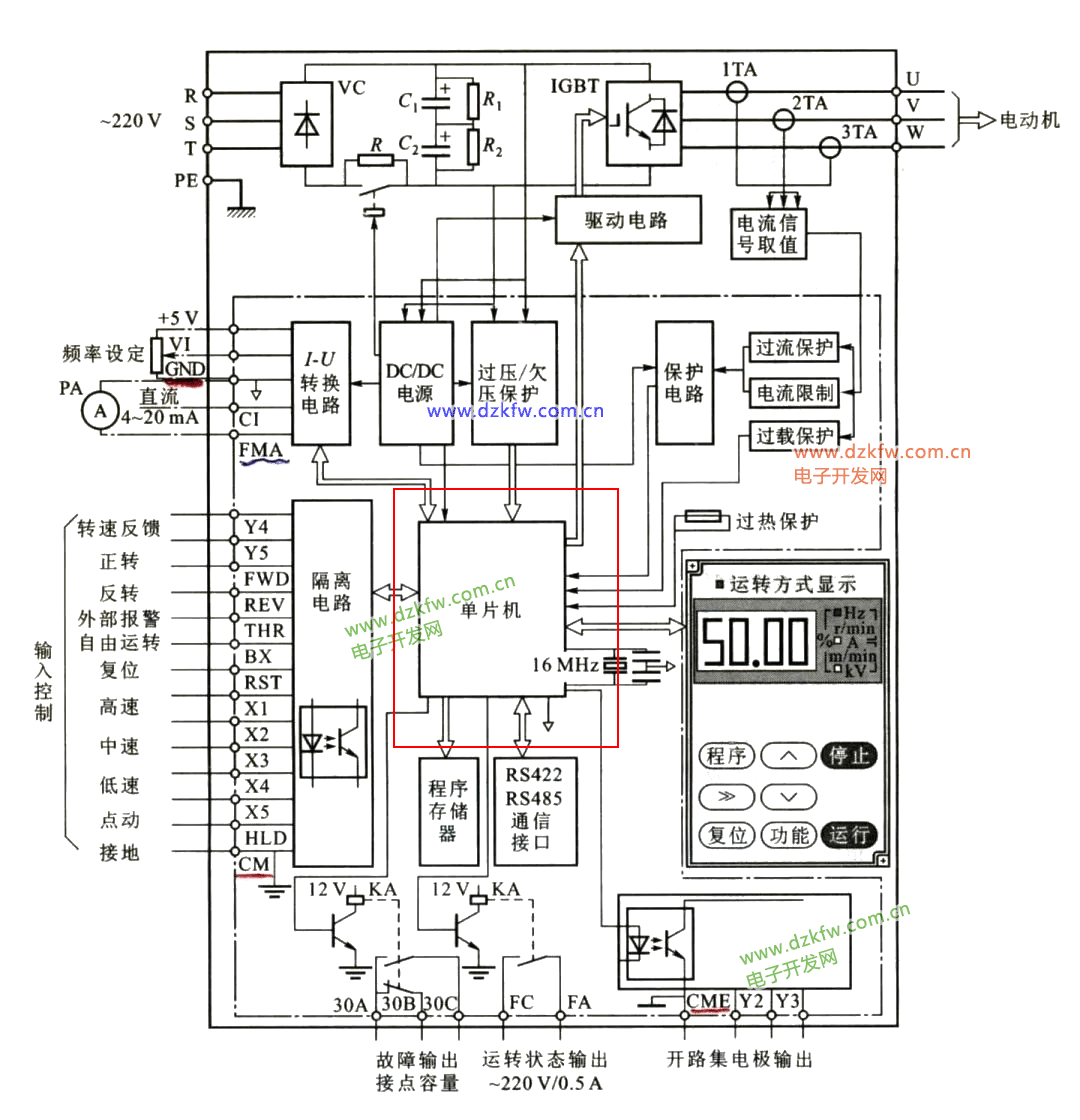 單片機又稱CPU,是整個變頻器的核心器件,如同人的大腦,輸出各種控制信號和處理輸入、檢測等信號。