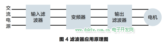 輸入濾波器安裝在變頻器的輸入側,它的主要作用是防止變頻器工作時,變頻器輸入端對電網和其它設備產生的干擾。輸出濾波器又叫出線濾波器,安裝在變頻器的輸出和電機之間,它的作用是濾除變頻器輸出電流中的高次諧波,保護電機,避免電機因為高度浪涌電壓造成絕緣破損,如圖4所示。