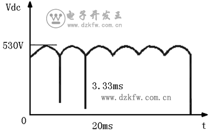 當變頻器不發生缺相的正常情況下工作時,Udc上的電壓如圖2所示,一個工頻周期內將有6個波頭,此時直流電壓Udc將不會低于470V,實際上對于一個7.5kW的變頻器而言,其C的值大小一般為900uf,當滿載運行時,可以計算出周期性的電壓降落大致為40V,紋波系數不會超過7.5%。而當輸入缺相發生時,一個工頻周期中只有2個電壓波頭,且整流電壓最低值為零。此時在上述條件下,可以估算出電壓降落大致為150V,紋波系數要達到30%左右。