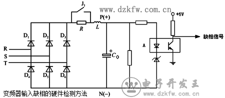 檢測變頻器輸入缺相,最簡單的一種方法就是使用硬件檢測,如圖3所示是其中的一種方法。該電路中C0上的電壓高低將反映R、S、T三相輸入有無缺相,當發生缺相時,C0上的電壓降低,光藕器件將不導通,A點的信號為高電平,對應缺相的發生。