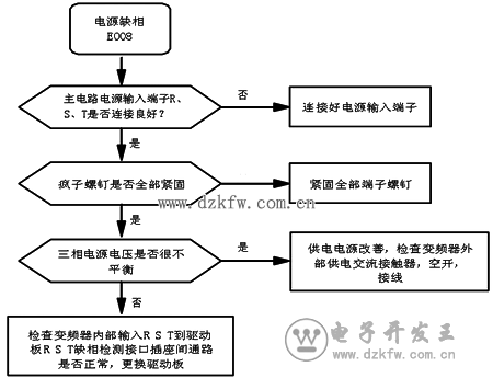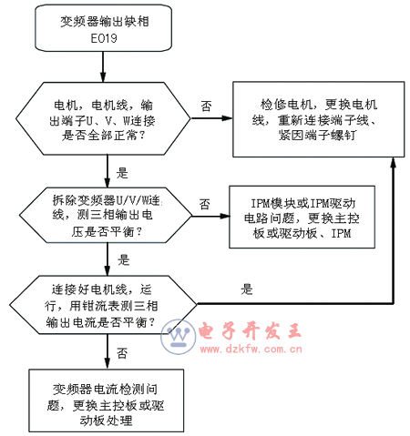 對于缺相故障,艾默生變頻器EV/TD系列故障代碼顯示E008(輸入側缺相)、E009(輸出側缺相)。故障定位如圖4和圖5所示。