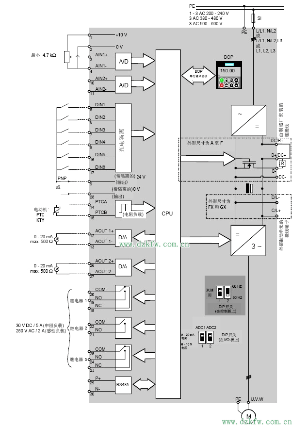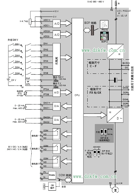 主線路分別接入三相電,輸出端接電機(jī)。控制線路要看你什么控制方式,一般需要接的有啟動(dòng)信號(hào),速度選擇信號(hào)等。