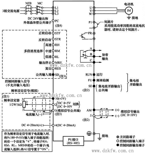 現在以三菱高性能、多功能的FR-E540為例來闡述。該系列變頻器的基本接線圖如下圖所示。