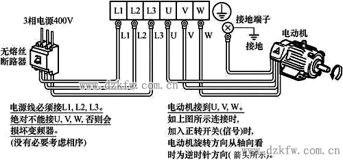 ②電源一定不能接到變頻器輸出端上(U,V,W),否則將損壞變頻器。