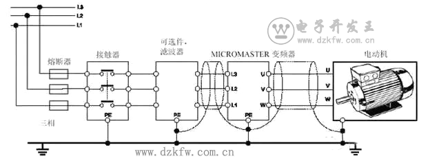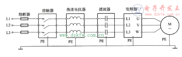 上圖是一副變頻器接線圖。在變頻器的安裝中,有一些問題是需要注意的。例如變頻器本身有較強的電磁干擾,會干擾一些設(shè)備的工作,因此我們可以在變頻器的輸出電纜上加上電纜套。又或變頻器或控制柜內(nèi)的控制線距離動力電纜至少100mm等等。