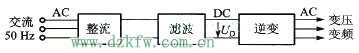 先將頻率固定的交流電整流后變成直流電,再經(jīng)過(guò)逆變電路,把直流電逆變成頻率連續(xù)可調(diào)的三相交流電,由于把直流電逆變成交流電較易控制,因此在頻率的調(diào)節(jié)范圍以及變頻后電動(dòng)機(jī)特性改善等方面,都具有明顯優(yōu)勢(shì),目前使用最多的變頻器均屬于交-直-交變頻器。其組成方框圖如圖所示。