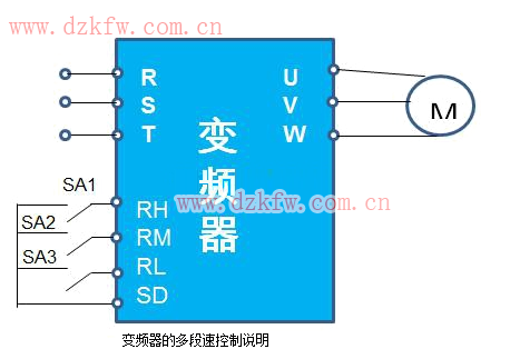 RH、RM,RL3個端子組合可以進行7擋轉速控制,各擋的具體運行頻率需要用相應參數設置。