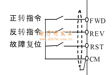 將變頻器的控制端子FWD與COM短接時(shí)正傳啟動(dòng),斷開停機(jī)。