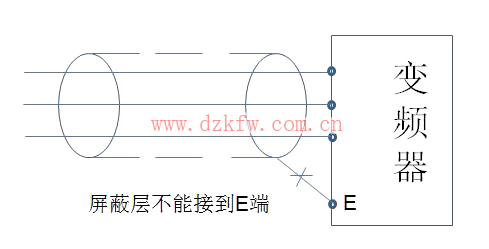 由于模擬量信號易受干擾,因此需要采用屏蔽線作模擬量接線。diangon.com模擬量接線如下圖所示,屏蔽線靠近變頻器的屏蔽層應接公共端(COM),而不要接E端(接地端),屏蔽層的另一端要懸空。