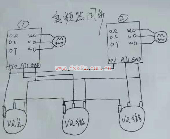 1)分別將兩臺(tái)變頻器的10V短接,GND短接,主調(diào)電位器1號(hào)腳接入10V,3號(hào)腳接GND,兩個(gè)微調(diào)電位器1號(hào)接入主調(diào)電位器的2號(hào)腳,2號(hào)腳接入AI1,3號(hào)腳接GND,