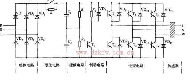 主要由整流電路、限流電路、濾波電路、制動電路、逆變電路和檢測電路的傳感器部分組成,如圖1所示。