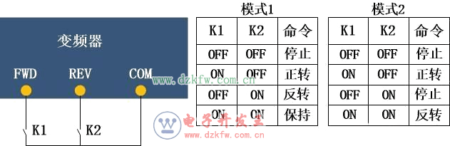 兩線制的,這種接線方向最為常見,使能信號和方向信號合并到一塊,由定義端子FWD、REV來決定電機的正反轉。兩個開關K1和K2分別控制正轉和反轉運行,當開關斷開則停止運行,這種接線方式最簡單,也好理解。