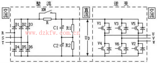 從R、S、T端輸入的三相交流電,經(jīng)三相整流橋(由二極管D1~D6構(gòu)成)整流成直流電,電壓為UD。