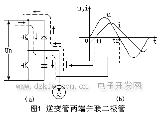 逆變電路的每個逆變管兩端,都要反向并聯一個二極管,如圖1(a)所示。其作用描述如下:異步電動機的定子電路是感性電路,其電流的變化滯后于電壓,如圖1(b)所示。圖中: