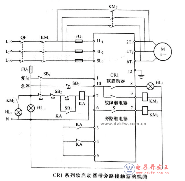 工作原理:合上斷路器QF,電源指示燈HL1點亮,進線接觸器KM1吸合。啟動時,按下啟動按鈕SB1,中間繼電器KA得電吸合并自鎖,其常閉觸點斷開,常開觸點閉合,軟啟動器的端子