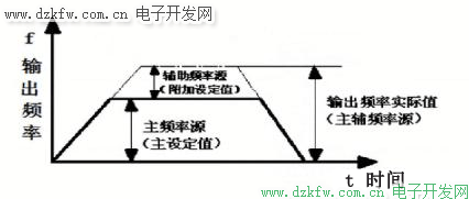 值得說明的一點(diǎn):設(shè)置頻率源主設(shè)定頻率源和輔助頻率源,主輔頻率源組合相加是由6種基本頻率源來設(shè)置輸出頻率