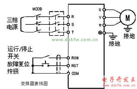 變頻器主回路接線:(R、S、T)分別為電源進電,變頻器輸出端子(U、V、W)分別接到電動機上。