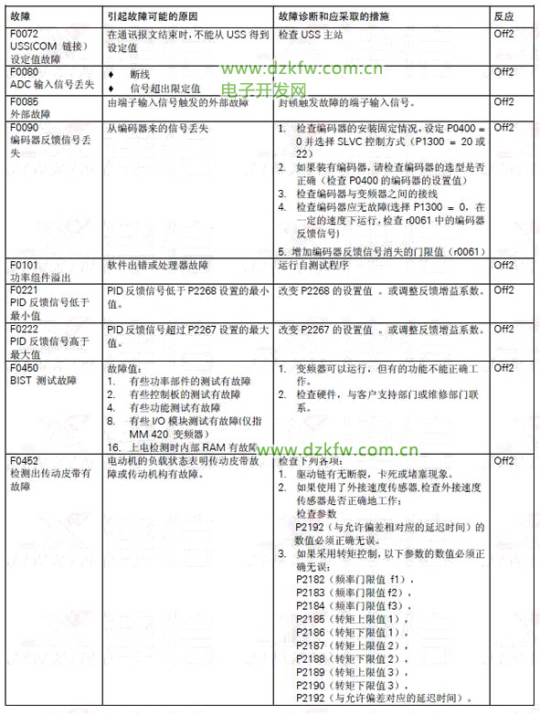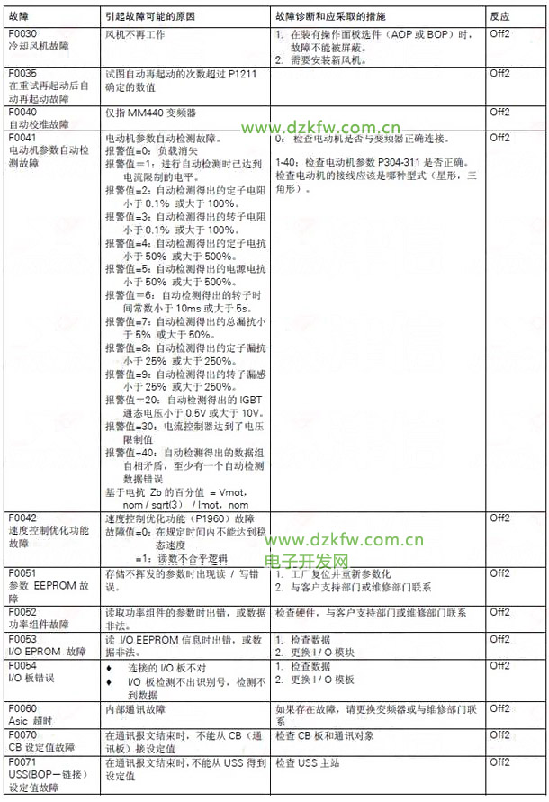 故障信息以故障碼序號的形式存放在參數R0947 中(例如,F0003=3)。相關的故障值可以在參數R0949 中查到,如果該故障沒有相關的故障值,R0949 中將輸入0。而且,可以讀出故障發生的時間(R0948)和存放在參數R0947 中的故障信息序號(P0952)。