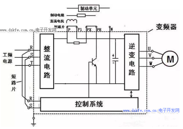 從上圖可以看出,變頻器的結(jié)構(gòu)是,先把工頻電源,整流成直流,逆變成可變電壓和頻率的電源來帶動電機,任何變頻器都一樣,只要接對主回路和控制回路就好了。