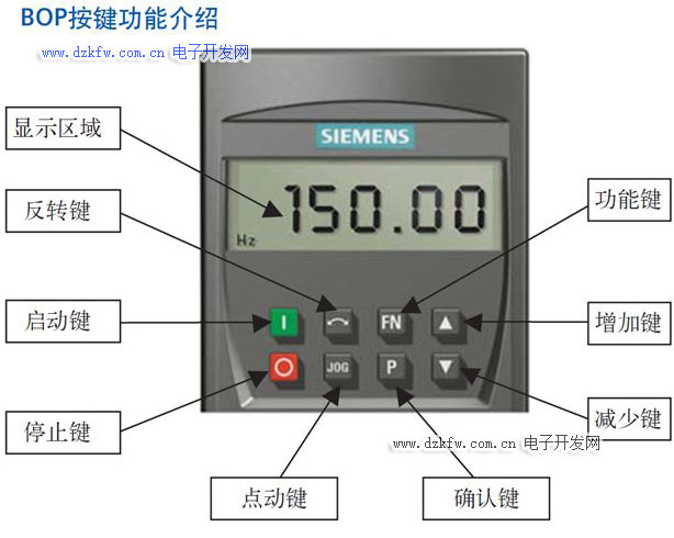 所謂變頻器的面板控制,就是說變頻器的加減速,正反轉(zhuǎn),停車等操作全部通過BOP面板來控制,BOP面板見下圖: