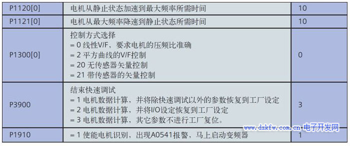 2、設(shè)置電動機(jī)參數(shù),為了使電動機(jī)和變頻器相匹配,需要設(shè)置電動機(jī)參數(shù)。電動機(jī)參數(shù)設(shè)置見下表。電動機(jī)參數(shù)設(shè)定完成后,設(shè)P0010=0,變頻器當(dāng)前處于準(zhǔn)備狀態(tài),才可正常運(yùn)行。