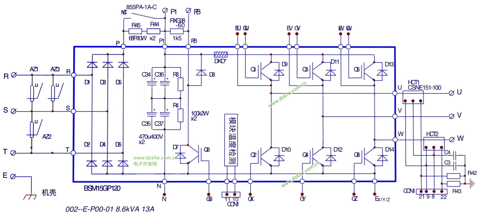 制動單元電路通常由三部分組成:1 .電源電路由降壓變壓器整流、濾波、穩(wěn)壓得到;通過功率電阻降壓穩(wěn)壓獲得;注意第一點和第二點,是通過開關電源的逆變、整流、穩(wěn)壓得到的。本電路采用第一種供電方式。2.DC電路電壓檢測(采樣)電路:一般由電阻分壓網(wǎng)絡獲得,然后由后級的電壓比較器取出制動動作信號,送到后級的IGBT模塊驅動電路。3.IGBT模塊驅動電路。簡單來說,制動單元就是一個電子開關,承擔著將制動電阻連接到DC電路的任務。用接觸器代替這個電子開關也不是不可能的。反正開關打開時,電路中還有一個“限流”的制動電阻,所以開關本身的安全性還是有保證的,只有開關的額定電流值才能拿走一定的財富。對于電子開關器件,當然也要考慮工作中的散熱問題。簡單的控制就是電壓比較器的輸出信號直接控制驅動器IC的輸出。當DC電路電壓高達660V時,模塊打開(開關閉合),連接制動電阻進行“能耗制動”。當DC電路電壓回落到600V左右時,電壓比較器的輸出狀態(tài)反轉,模塊關斷(開關關斷),制動動作結束。制動點和終點的設定沒有那么嚴格和準確,各廠家的設定值可能會有一些偏差,只要保護好DC電路不受高壓沖擊即可。注意一點驅動電路,IGBT模塊是脈沖驅動,效果更好。