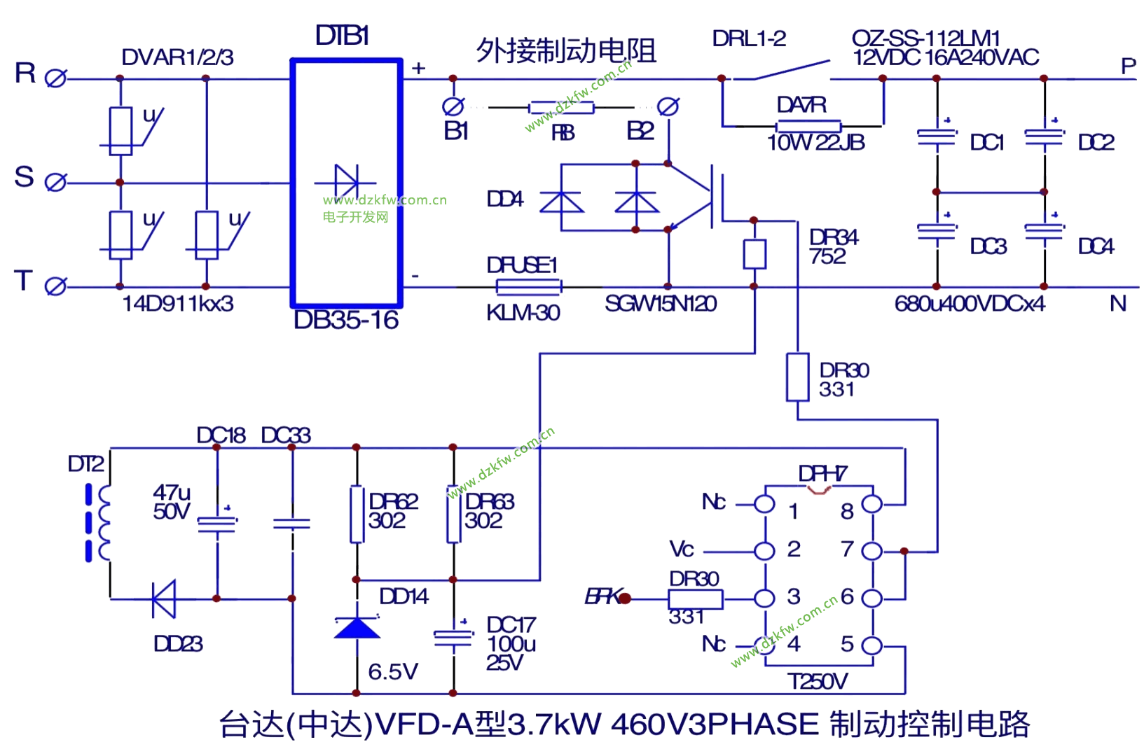 2.DC電路電壓檢測電路將其處理成DC開關信號,直接控制光耦,進而控制制動開關管的開閉。