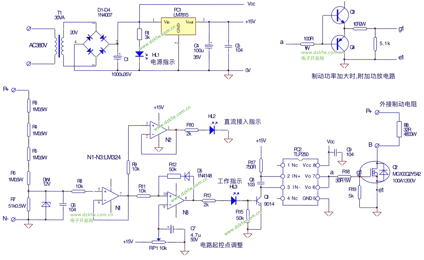 該制動單元的電源由380V/18V變壓器獲得,15V穩(wěn)壓電源由整流、濾波、穩(wěn)壓電路取出供整機控制電路使用。