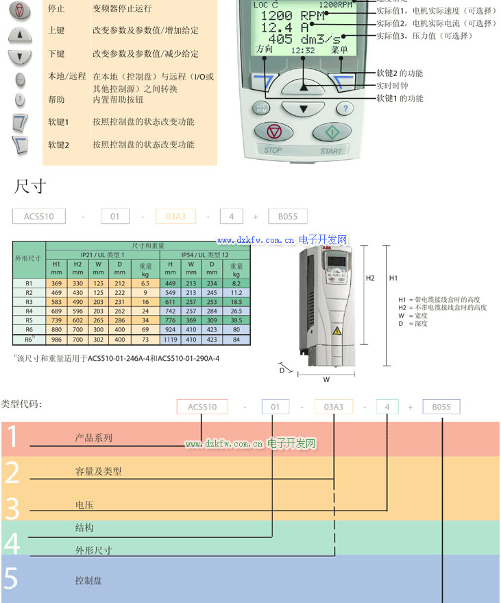ABB變頻器配有一個圖形顯示終端(即參數設定和就地控制面板),其包括圖形顯示器(顯示各種參數)。