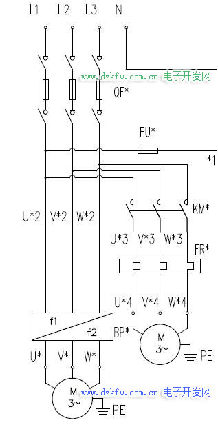 1,主電路設(shè)計(jì),如圖,L1、L2、L3、N為電源進(jìn)線,QF為熔斷隔離器,BP為變頻器,出電纜直接接電機(jī)(距離遠(yuǎn)時(shí)加裝出現(xiàn)電抗器),右側(cè)KM為變頻電機(jī)冷卻風(fēng)扇控制接觸器。