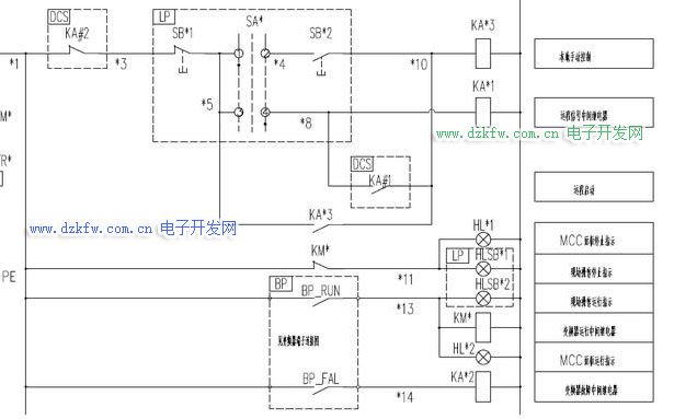 2,控制電路設(shè)計(jì),如圖,虛線框DCS為遠(yuǎn)程控制,LP為就地操作柱,BP為變頻器,此電路設(shè)計(jì)為無擾切換遠(yuǎn)程和就地,KA#2為DCS控制停止,KA#1為DCS控制啟動(dòng),SB1為操作柱控制停止,SB2為操作柱控制啟動(dòng),KA*1為遠(yuǎn)程控制信號繼電器,設(shè)置繼電器是為了防止AC220V控制線和DC24信號線施工出錯(cuò),造成DCS模塊傳入強(qiáng)電燒毀。