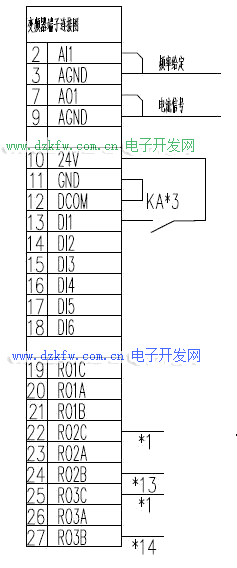 變頻器接線端子圖,如圖,AI1的信號輸出接入DCS,設(shè)置頻率給定,4~20ma信號,AO1的信號接入DCS,反饋運(yùn)行電流(或者轉(zhuǎn)速、頻率等,可自行設(shè)定),KA*3是變頻器啟動(dòng)命令。RO2為變頻器繼電器輸出,該繼電器設(shè)置為運(yùn)行信號,當(dāng)變頻器運(yùn)行后,繼電器閉合,KM吸合,變頻電機(jī)的冷卻風(fēng)扇運(yùn)行。RO1為變頻器繼電器輸出,該繼電器設(shè)置為故障信號,當(dāng)變頻器檢測到故障,繼電器閉合,KA*2吸合,為故障故障輸出中間繼電器。