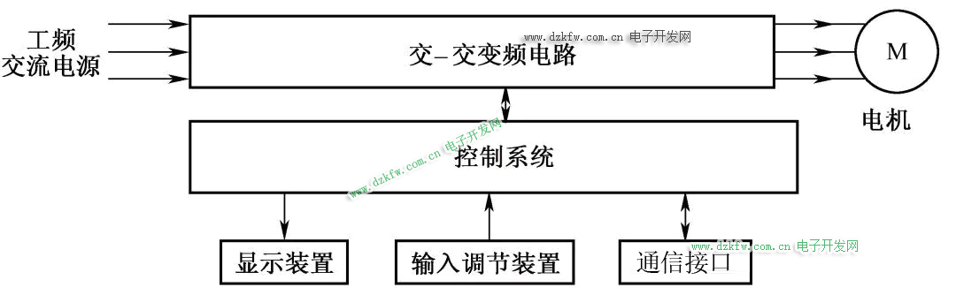 變頻器的功能是將工頻(50Hz或60Hz)交流電源轉換成頻率可變的交流電源提供給電動機,通過改變交流電源的頻率來對電動機進行調速控制。變頻器種類很多,主要可分為兩類:交-直-交型變頻器和交-交型變頻器。