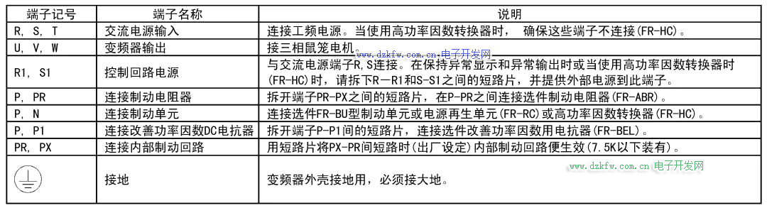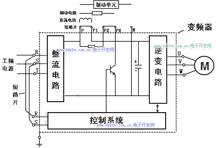 P、N端子分別為內部直流電壓的正、負端,如果要增強減速時的制動能力,可將PX、PR端子之間的短路片取下,再在P、N端外接專用制動單元(即制動電路)。