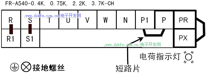 主回路接線端子排如下圖所示。端子排上的R、S、T端子與三相工頻電源連接,若與單相工頻電源連接,必須接R、S端子;U、V、W端子與電動機連接;P1、P端子,RP、PX端子,R、R1端子和S、S1端子用短接片連接;接地端子用螺絲與接地線連接固定。