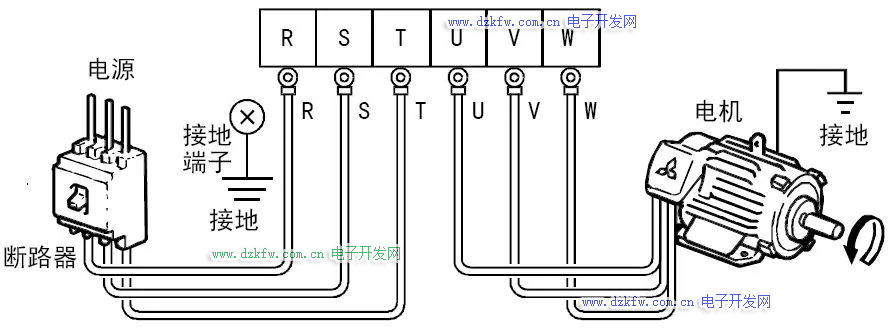 在連接時要注意電源線絕對不能接U、V、W端,否則會損壞變頻器內部電路,由于變頻器工作時可能會漏電,為安全起見,應將接地端子與接地線連接好,以便泄放變頻器漏電電流。