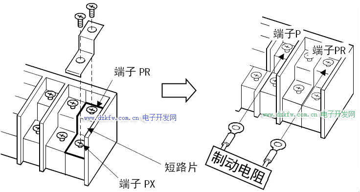 先將PR、PX端子間的短路片取下,然后用連接線將制動電阻與PR、P端子連接。