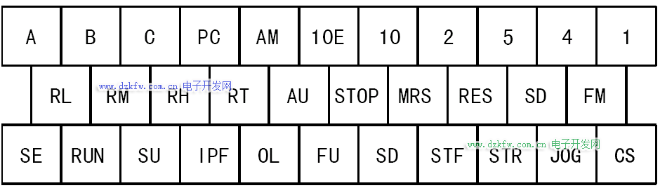 圖中的正轉按鈕需接在STF端子與PC端子之間,當按下正轉按鈕時,變頻器內部電源產生電流從PC端子流出,經正轉按鈕從STF端子流入,回到內部電源的負極,該電流的途徑如圖所示。另外,當變頻器內部三極管集電極開路輸出端需要外接電路時,須以SE端作為公共端,并要求電流從SE端流入,在內部流經三極管,最后從相應端子(如圖中的RUN端子)流出,電流的途徑如圖中箭頭所示,圖中虛線連接的二極管表示在源型控制邏輯下不能導通。