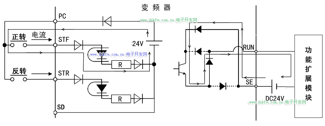 圖中的正轉按鈕接在STF端子與SD端子之間,當按下正轉按鈕時,變頻器內部電源產生電流從STF端子流出,經正轉按鈕從SD端子回到內部電源的負極,該電流的途徑如圖所示。另外,當變頻器內部三極管集電極開路輸出端需要外接電路時,需要以SE端作為公共端,外接電路的電流從相應端子(如圖中的RUN端子)流入,在內部流經三極管,最后從SE端子流出,電流的途徑如圖中箭頭所示,圖中虛線連接的二極管表示在漏型控制邏輯下不導通。