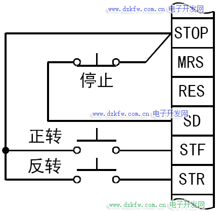 上圖中的停止按鈕是一個常閉按鈕,當按下正轉按鈕時,STF端子會流出電流,途徑是:STF端子流出→正轉按鈕→STOP端子→停止按鈕→SD端子流入,STF端子有電流輸出,表示該端子有正轉指令輸入,變頻器輸出正轉電源給電動機,讓電動機正轉。松開正轉按鈕,STF端子無電流輸出,電動機停轉。如果按下停止按鈕,STOP、STF、STR端子均無法輸出電流,無法啟動電動機運轉。