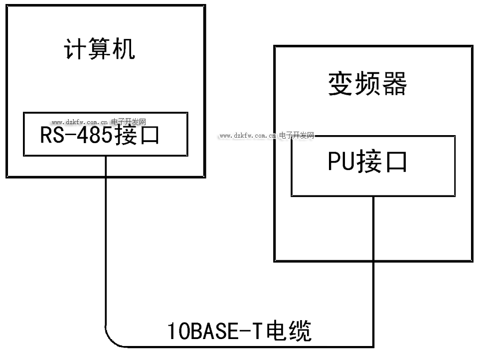 計算機與單臺變頻器連接時,PU接口的連接如下圖所示。在連接時,計算機的RS-485接口和變頻器的PU接口都使用RJ45接頭(俗稱水晶頭),中間的連接線使用10BASE-T電纜(如計算機聯網用的雙絞線)。