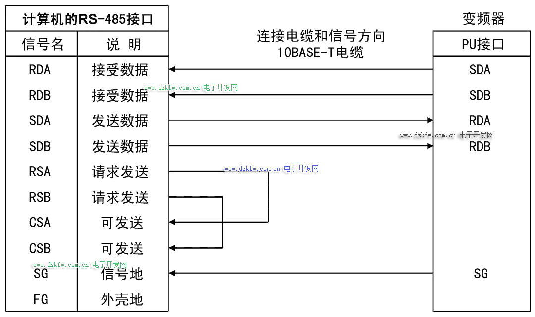 PU接口與RS-485接口的接線方法如下圖所示。由于PU接口的引腳②和引腳⑧的功能是為操作面板提供電源,在與計算機進行RS-485通訊時不用這些引腳。