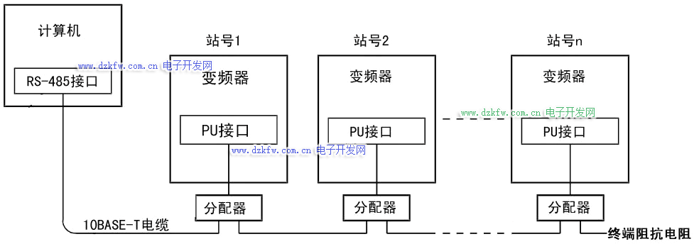 計算機與多臺變頻器連接時,PU接口的連接如下圖所示。圖中分配器的功能是將一路信號分成多路信號,另外,由于傳送速度、距離的原因,可能會出現信號反射造成通信障礙,為此可給最后一臺變頻器的分配器安裝終端阻抗電阻(100Ω)。