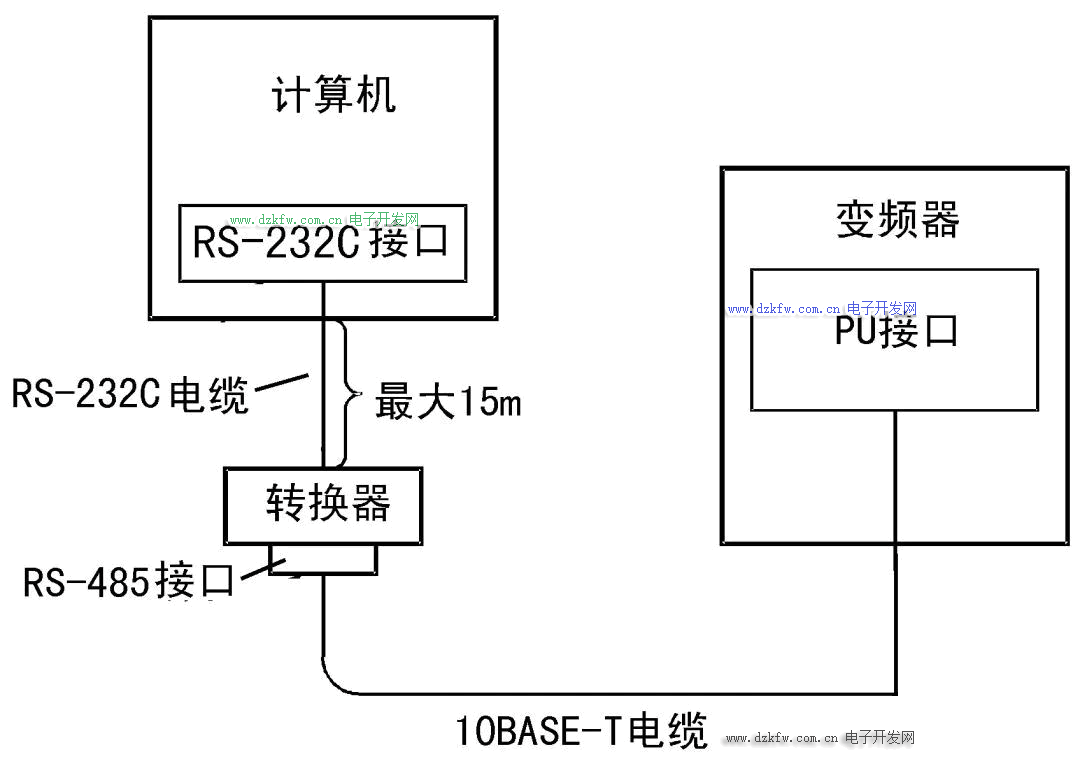 由于大多數計算機不帶RS-485接口,而帶RS-232C接口(串口,又稱COM口)的計算機較多,為了使帶RS-232C接口的計算機也能與PU口連接,可使用RS-232C轉 RS-485接口轉換器。