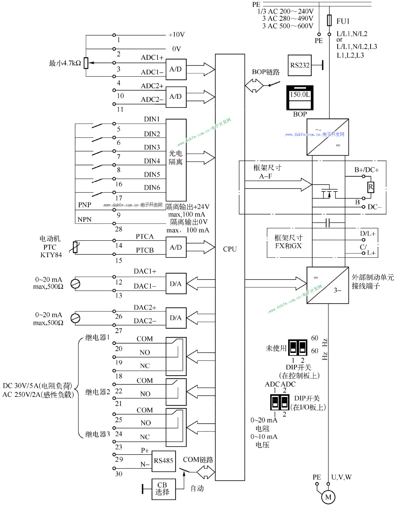 MM440變頻器的核心部件是CPU單元,根據設定的參數,經過運算輸出控制正弦波信號,再經過SPWM調制,放大輸出正弦交流電驅動三相異步電動機運轉。