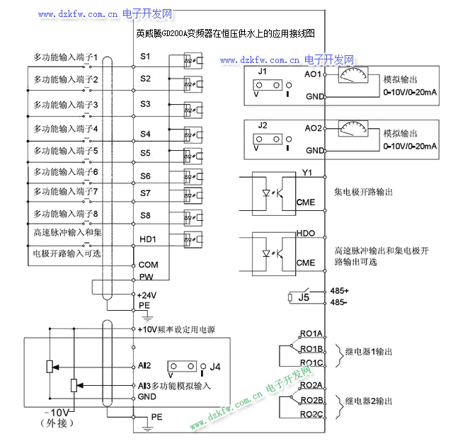 摘 要:相對于傳統的水箱和水塔的供水,變頻恒壓供水具有眾多的節電節水、不對水資源造成污染等優點。本文以某供水廠用變頻器一拖多臺泵的方式實現恒壓供水為例,詳細介紹了英威騰電氣股份有限公司開發的Goodrive200A系列變頻器及其在恒壓供水系統中的應用。