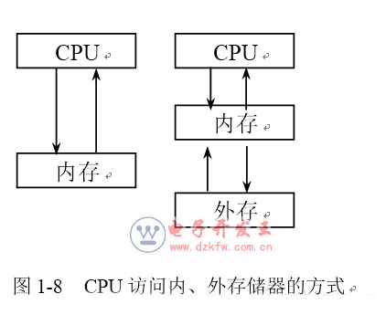 根據(jù)存儲器與CPU聯(lián)系的密切程度可分為內(nèi)存儲器(主存儲器)和外存儲器(輔助存儲器)兩大類。內(nèi)存在計算機(jī)主機(jī)內(nèi),它直接與運(yùn)算器、控制器交換信息,容量雖小,但存取速度快,一般只存放那些正在運(yùn)行的程序和待處理的數(shù)據(jù)。為了擴(kuò)大內(nèi)存儲器的容量,引入了外存儲器,外存作為內(nèi)存儲器的延伸和后援,間接和CPU聯(lián)系,用來存放一些系統(tǒng)必須使用,但又不急于使用的程序和數(shù)據(jù),程序必須調(diào)入內(nèi)存方可執(zhí)行。外存存取速度慢,但存儲容量大,可以長時間地保存大量信息。CPU與內(nèi)、外存之間的關(guān)系如圖1-8所示。