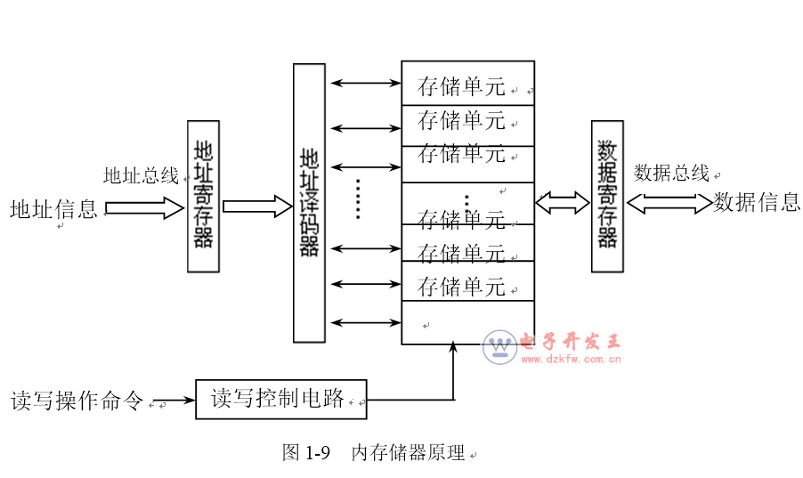 對存儲器的操作通常稱為訪問存儲器,訪問存儲器的方法有兩種,一種是選定地址后向存儲單元存入數(shù)據(jù),被稱為“寫”;另一種是從選定的存儲單元中取出數(shù)據(jù),被稱為“讀”。可見,不論是讀還是寫,都必須先給出存儲單元的地址。來自地址總線的存儲器地址由地址譯碼器譯碼(轉(zhuǎn)換)后,找到相應(yīng)的存儲單元,由讀/寫控制電路根據(jù)相應(yīng)的讀、寫命令來確定對存儲器的訪問方式,完成讀寫操作。數(shù)據(jù)總線則用于傳送寫入內(nèi)存或從內(nèi)存取出的信息。主存儲器的結(jié)構(gòu)框圖如圖1-8所示